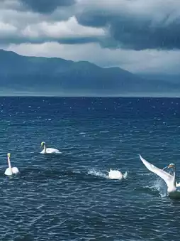 Swans swim gracefully in the rain, their white feathers intertwined with the rain curtain. Occasionally, they flap their wings, splashing water. Flowers and plants by the lake sway gently in the rain, emitting a faint fragrance.