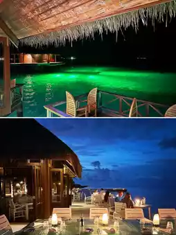 The entire resort is quiet and elegant. This time we stayed in the Sunset Overwater Pool Villa on Lovers Island, the Supreme Overwater Pool Villa on Family Island ~ and the Moya Undersea Suite. Every day we wake up from the soothing sound of the ocean, and gaze at the endless blue scenery through the private sunbathing platform at sunrise. Enjoy the romantic time of the sunset reflecting the sky and the sea at sunset. The two islands have their own breakfast restaurants ~ You can also take a boat to experience different cuisines ~ Undersea restaurant, overwater restaurant, overwater SPA and overwater swimming pool, the hotel's various facilities are very good!