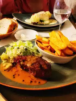 There aren’t many dining options nearby, so I usually eat at the hotel restaurant. The food there is excellent, especially the mussels. Among all the restaurants I’ve tried, this is the only one that serves mussels, so of course, I had to order them. The steak is tender, and I can never finish the fries 🫣.