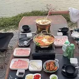 Inlaya has a barbecue-shabu area by the lake, with a view of the mountains and a beautiful sunset. It feels great! 🌅🫶🏻