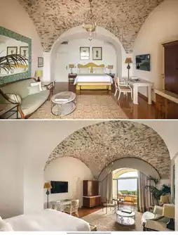 Spaces blend "vintage + refined" romance 🛏️ Stone vaulted ceilings, artistic decor, and cloud-soft beds invite relaxation. Balcony loungers deliver sea breezes and mountain views on demand. Marble bathrooms with deep tubs make post-soak robe-and-view moments so blissful, you'll never want to leave.