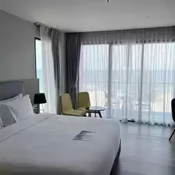Fortune Hotel Sangchan Beach Rayong, quiet atmosphere, clean room, good service from the receptionist. Behind is a river view, mangrove forest with a bridge for walking and exercising. The morning air is cool and comfortable. The room has complete amenities, including towels, shampoo, soap, toothbrush, toothpaste, shower cap, refrigerator, hair dryer, kettle, drinking glass, clean bathroom, good water pressure, hot water works normally. Breakfast has a variety of services, including pork congee, curry rice, bread, sausage, fried eggs, omelets, vegetable and fruit salad, coffee, drinks, everything is available. The staff provides good service for clearing the dishes. #Rayong hotel