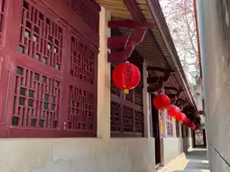 that are nestled on the hillside, providing a warm and cozy atmosphere surrounded by shady trees,