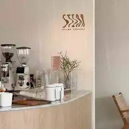 STIRR Coffee Cafe is decorated in a minimalist style, white and brown, perfectly Korean style. 🤎 There are large glass windows, the light enters the shop, the view in front is the sea, the vibe is very good. 🪞🌊⛅️