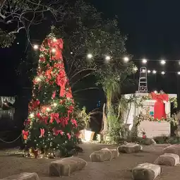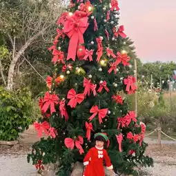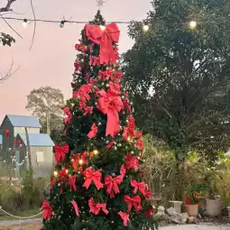 with a large Christmas tree tied with a red bow, beautiful both inside