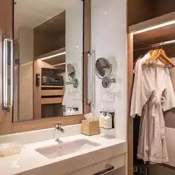 As for the room, we got a room on a high-angle floor with a good view and a sea view. The room is spacious. The bathroom is luxuriously designed. There is a partition door that can be slid open to see the bathroom or closed for privacy.