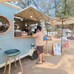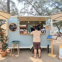 𝐓𝐫𝐢𝐩𝐥𝐞 𝐎 𝐂𝐨𝐟𝐟𝐞𝐞 Cafe with a super chill view on Laem Charoen Beach with a pastel blue coffee truck under a pine tree. There are chic photo spots, with umbrellas, chairs, mirrors, and flower tables. The background is a murky blue-green sea. It's soooooo good
