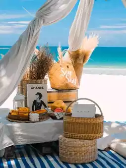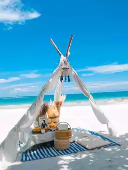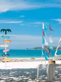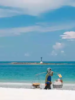The sand on the beach is white, the sea water is clear, very enjoyable to sit on