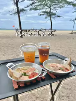 🐶 Bring your dog to chill on the beach at Laem Charoen at Haus coffee and space 📍 Haus Coffee and Space is a cute little food truck coffee shop. The brown and cream tones are easy on the eyes and match the beach atmosphere. The shop has a variety of drinks and toasts. We ordered peach tea and orange coffee to eat with fried eggs that we ordered from another shop. We sat and ate, watched the sea, and felt the breeze in a chill way. The atmosphere in the morning is very good.