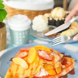 🍑 Peach Melba Crepe Serves the sweet aroma of candied peaches with a soft crepe, vanilla ice cream, and lots of whipped cream, topped with raspberries and strawberries, and poured with juicy berry sauce. Screamingly delicious!