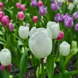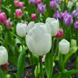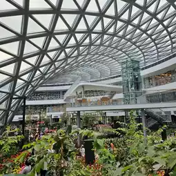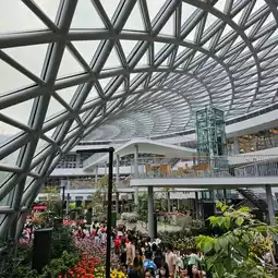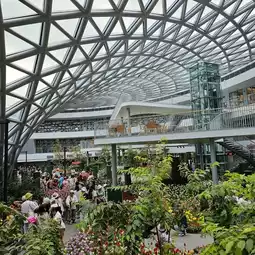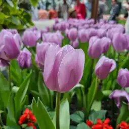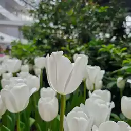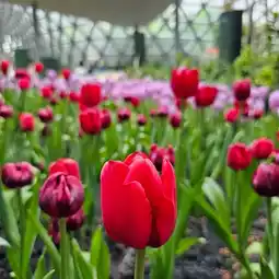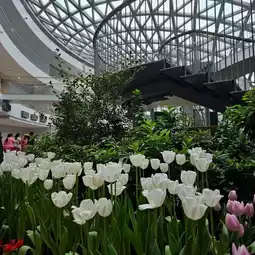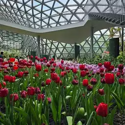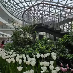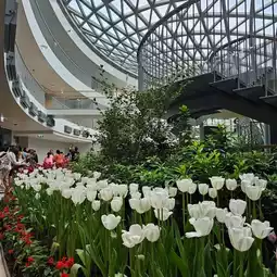 This is a beautiful garden in the Flora Exhibition Hall. This is a winter flower garden with many tulips and hydrangeas. They bloom beautifully in bright colors and various colors in a beautifully modern building. It is considered the most vibrant in this area. The building is transparent and receives natural light. The temperature inside is 15 degrees Celsius. It is recommended to wear a sweater. The exhibition is in the PTTLNG Flora Exhibition Hall. The coolness comes from Liquid Natural Gas or liquefied natural gas. It uses a process of changing the state from liquid to gas, which creates a lot of leftover coolness. PTTLNG uses this leftover coolness to air the building and also has a winter plant exhibition that can be visited all year round in the center of the building.