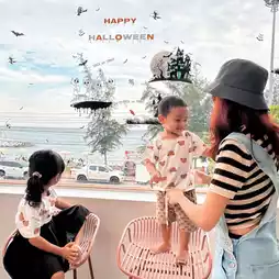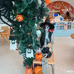 The shop is decorated in Korean style. There are cute photo corners. The shop is currently decorated in Halloween style. There are seating areas both upstairs and downstairs.