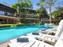 Finally, we have Samed Hideaway Resort, a beachfront accommodation with a swimming pool on Koh Samet, Rayong. This resort offers a great atmosphere, stunning views, an excellent swimming pool, and a private beach. There is also a terrace where guests can sunbathe and achieve a beautiful tan. The resort's style focuses on a tropical theme, using trees to provide shade, making the place look lush, cool, and green, different from other seaside accommodations. All rooms come with a garden and sea view. If you enjoy relaxing in a serene, green environment with a cool sea breeze, Samed Hideaway Resort is highly recommended.