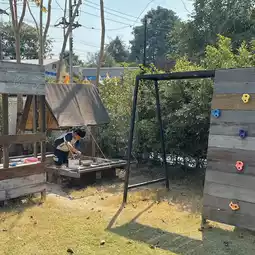 The shop is called 𝗭𝗲𝗿𝗼 𝗦𝘁𝗿𝗲𝘀𝘀 𝗖𝗮𝗳𝗲 𝗮𝗻𝗱 𝗚𝗮𝗿𝗱𝗲𝗻 (Stress = Zero). It is a wooden house-style cafe with a shady atmosphere. It feels like visiting your grandmother in the province. We like this place. There is a garden corner, a swing, a sand house, a playground, and activities for children to collect organic eggs (a great activity).