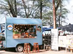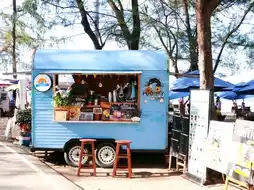🏝️Happy Lava is a coffee shop by the sea in the form of a food truck in pastel blue. They serve coffee, cocoa lava, and many other drinks. Toasted bread on a stick, crispy on the outside, soft on the inside, fragrant, is another menu that you shouldn't miss.