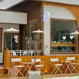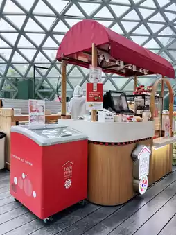 In the tulip garden at PTTLNG, Rayong, there's a small dessert shop called Haru Miki House, right next to Cafe Amazon. The white shop with the red roof is incredibly eye-catching.