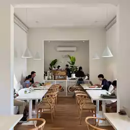 This is another cafe with a very beautiful design. The building has a modern geometric design, cream-white color, with beautiful natural light passing through. This is another shop where taking pictures from any angle is beautiful. In addition, the shop also offers food, drinks, coffee, non-coffee, and bakery products.