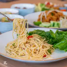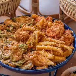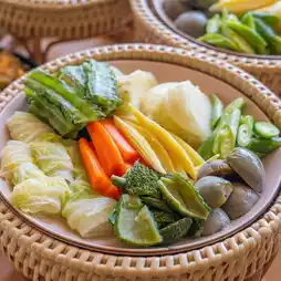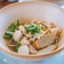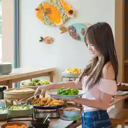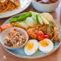 Just 259 baht per person. Enjoy local Thai dishes, including rice with chili paste and fresh vegetables, spicy salads, pad thai, Rayong's local dish, pork with star gooseberry, noodles, international dishes, and desserts. Herbal drinks are also available.