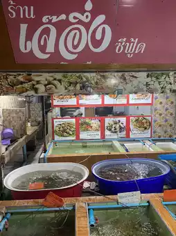 If you're visiting Rayong and looking for fresh seafood by the sea, we recommend this restaurant: Je Ueng Seafood on Mae Ramphueng Beach in Rayong Province. This beachfront restaurant offers delicious food, fresh ingredients, and a selection of shrimp, shellfish, crab, and fish. It's like the ocean has been brought to you, allowing you to choose your own. The atmosphere is great. You can choose to dine in the building or on the beach, enjoying the view and the sea breeze.