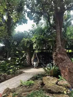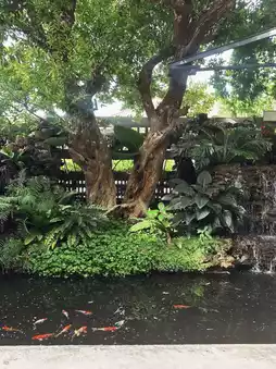 Large trees and a breathtaking view of the back of the shop. I love that they have an air-conditioned room at the back. There's both indoor and outdoor seating, complete with a koi pond for a chill vibe. Everyone here looks so cool! 😎