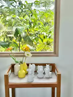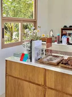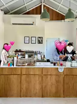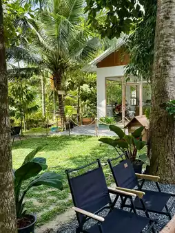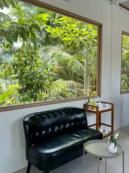 A garden-style cafe with a wonderful atmosphere. Located in Ban Khai District, Rayong Province, I love the shady atmosphere and the abundance of trees. It's so natural. The shop offers a full menu of coffee, non-coffee, and matcha. They also have shio bread for dessert. Rose tried the coconut matcha, which was incredibly delicious! 🫶🏻