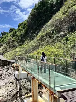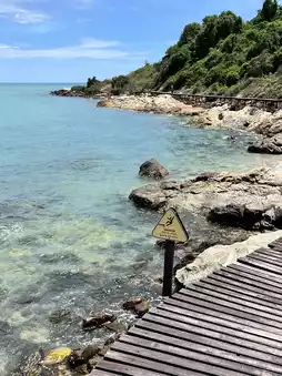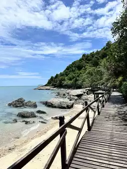 Khao Laem Ya, a popular photo spot among influencers, is a national park located next to the sea in Rayong Province. The water is incredibly clear, and the color is truly impressive. A must-see for visitors is the wooden and glass bridges that run along the park's mountainside. The park offers numerous photo opportunities, ensuring a beautiful view from every angle. In addition to the crystal-clear water, the park also features a nature trail, approximately 2 kilometers long. You'll even be greeted by friendly monkeys. The monkeys are gentle and friendly. We recommend visiting in the evening for a shady atmosphere and a romantic sunset.