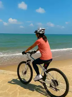 This morning, we started off by cycling along Mae Ramphueng Beach. The cool sea breeze blew across our faces, and the rhythmic sound of waves crashing against the shore brought an indescribable sense of calm. 🚴♂️🌴