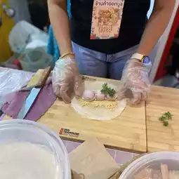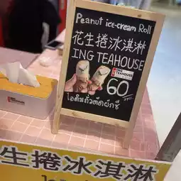 Taro Ice Cream with Peanuts and Coriander 🌿🌿The price is 60 baht. This menu is made fresh. Start by preparing the roti dough, sprinkle with small pieces of grated peanuts, giving it the same texture as #crumbs. Then top with the delicious purple taro ice cream and decorate with coriander. Then wrap it into a roll like roti sai mai and cut it into 2 pieces, wrap it in paper and eat it right away. 😋😋