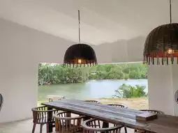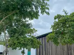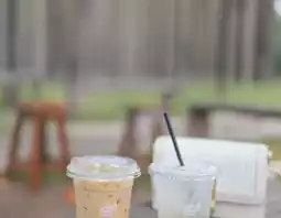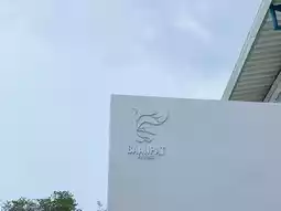A cafe in Rayong. The white cement shop stands out against the high wooden walls of the badminton court. There is a large lawn area, suitable for bringing pets to run around (pet friendly). The atmosphere is good, suitable for chilling out.