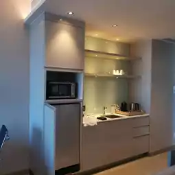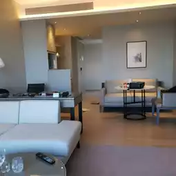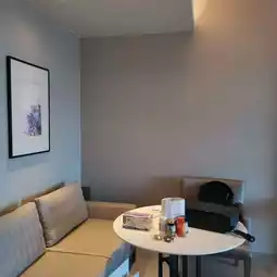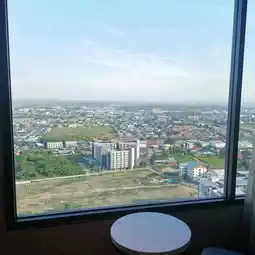 A comfortable hotel in the city center, next to a shopping mall and many restaurants. There are large rooms that can be used for parties, long-term stays, or families. Refrigerator and kitchen with food warming system, complete plates, bowls, and spoons, very large work desk.