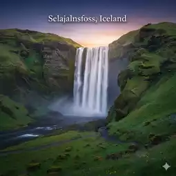 ภาพน้ำตก Seljalandsfoss ยามเย็น แสงอ่อนสะท้อนละอองน้ำ