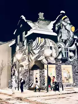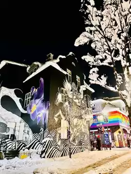 The snow adds charm to the colorful facades and murals that brighten up even the grayest skies 🎨.