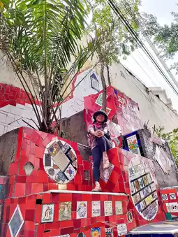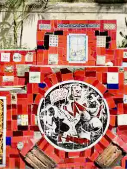 Initially, the tiles used in the work came from various construction sites in Rio and from urban waste on the streets. Later, most of the tiles were donated by tourists from all over the world. Of the more than 2,000 tiles, 300 were hand-painted by Seleron, depicting a pregnant African woman.