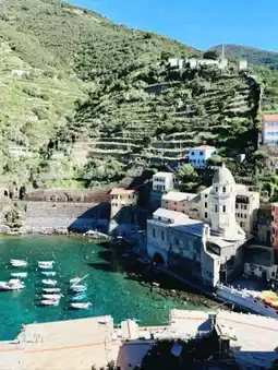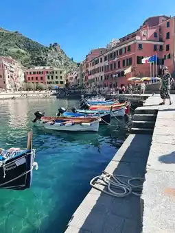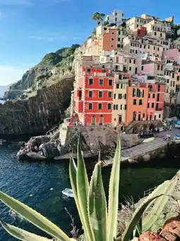 Riomaggiore, a picturesque village located in Italy's Cinque Terre region. Riomaggiore is the southernmost of the five villages that make up the Cinque Terre, a UNESCO World Heritage Site on the Ligurian coast. Colorful buildings: The village is famous for its vibrant, pastel-colored houses that are stacked along a steep ravine and overlook a tiny harbor.