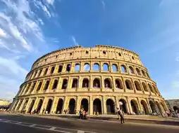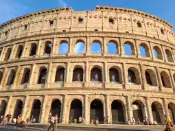 The Roman Colosseum, a treasure of ancient Rome, becomes even more enchanting at dusk as the golden rays of the setting sun illuminate this magnificent structure, adding a magical touch to the scene.