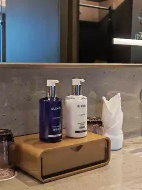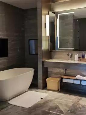 The one-bedroom suite with two bathrooms is square and spacious, with a logical layout. The living room has a balcony, which is unfortunately not accessible, and the double vanity wash area is huge. The hardware is even more impressive: electric curtains, capsule coffee machine, mirror smart TV facing the bathtub, and both bathrooms equipped with Washlet toilets, features that many full-service five-star hotels cannot match.