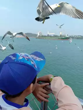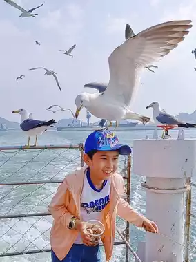 6⃣ It's just a few minutes' drive from the zoo to the Sea Donkey Island pier. Sea Donkey Island is not about landing on the island, it's a boat tour at sea, truly a kingdom of seagulls, the seagulls are very bold, dancing on my baby's head 😎 10 yuan for a portion of seagull food, which is a full cup of small fish, very conscientious, must feed the seagulls haha, my baby loved it