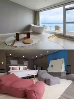 The room faces the sea directly 🌊 With floor-to-ceiling windows and a balcony, you can lie down and enjoy the breathtaking sea views, gorgeous sunsets, and evening glow. Every shot is postcard-worthy 📷 Especially in the evening, when the sunlight pours in, it’s so romantic—like living in a painting!