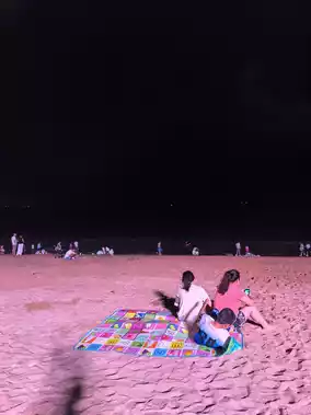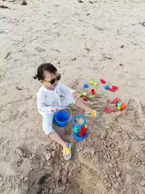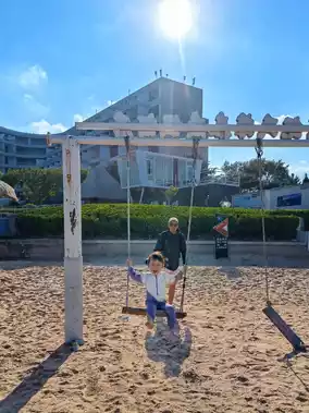 Pros: Suitable for swimming, not crowded, free foot rinsing, clear seawater, fine sand, swings (one high, one low) great for photos 📸