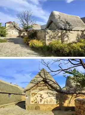 🏘️ Entering Seagrass House Village feels like stepping into a Hayao Miyazaki fairy tale world. Houses with seagrass roofs and stone walls are scattered in an orderly fashion. The soft autumn sunlight gently shines on the seagrass roofs, the silvery-white seagrass shimmering with a faint golden glow, harmonizing beautifully with the surrounding blue sky, white clouds, turquoise sea, and rocky reefs—truly a breathtaking sight.