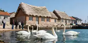 In the early morning, swans skim over the sea surface, their white wings cutting through the waves; in the afternoon, they gather on the shallows to forage, preen, and playfully chase each other; at dusk, the sunset gilds the swans’ feathers, creating a cinematic scene with the coastline.