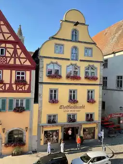 * The most photographed spot in Rothenburg, where two streets split around a yellow timbered house.