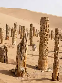 - 11:00 AM: Arrive at Xiaohe Cemetery, visit the "Hall of Death" — hundreds of poplar wood pillars stuck in the sand dunes, with various shapes, some with carvings.