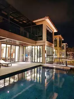 The Shanyuhu Villa where we stayed is hidden among the green hills and clear waters. The two-story detached design is perfect for multi-person gatherings. Each room has a private hot spring pool facing Blue Mountain Lake 🛁. Lying in the hot spring water and watching the sunset dye the lake red, I took so many photos that my phone died 📸