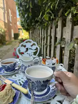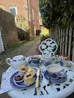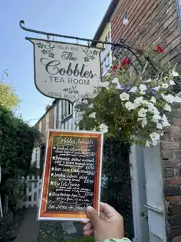 The Cobbles Tea Room, located in the charming town of Rye, is an award-winning English tea house renowned for its scones and cream tea. We tried both during our visit, and they were truly delightful, though slightly on the pricier side. The scones were wonderfully soft and fluffy, perfectly paired with clotted cream and raspberry jam—absolutely delicious! The cream tea was also a favorite of mine, with its rich, creamy, and aromatic flavor. The ambiance of the tea room made the experience even more enjoyable, as the establishment is beautifully decorated with fresh flowers and retains many traditional royal English tea house furnishings and utensils. Even the teapots were exquisitely designed, adding a touch of elegance. There's also a small courtyard garden within the restaurant, making it a perfect spot to relax while visiting Rye.