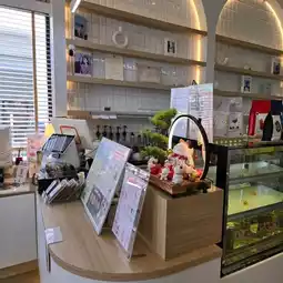 A small cafe decorated in white, cream, and minimalist tones. Inside, there are fluffy cats surrounding us, giving us the most enjoyable time to chat and play.