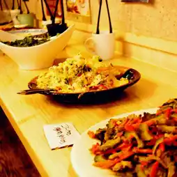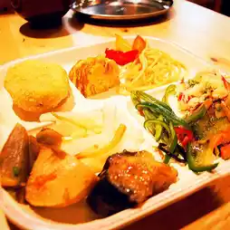 When I went, they had vegetable croquettes, bitter melon chanpuru (stir-fried gourd), tamagoyaki (rolled omelet), and a fruit platter.