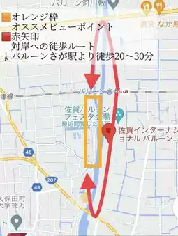 3 recommended points①You can see the whole view from the venue side②You can get a good view of the balloons flying in※Depending on the wind direction, you can see them flying well③You can see the reflection of the river※Since you are looking at it from both sides of the river, you can see the reflection of the balloons in the river wellThe place to see it is the orange frame part in the 8th picture, and you will take the route indicated by the red arrow. It is a 20-minute walk downstream from the venue (opposite the railroad tracks) is recommended