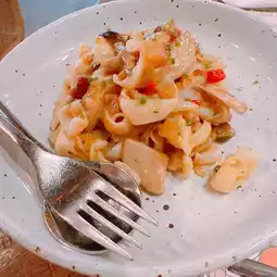 ❤️ Carbonara squid wide noodles, super elastic and very chewy, very special texture. After being served with mixed mushrooms, the aroma is even stronger