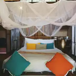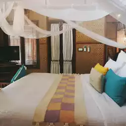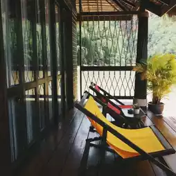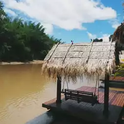 Each villa is spacious and private, with teak furniture and thatched roofs, blending the local art with the surrounding nature. In addition, there is a balcony extending into the river and a swing for you to sit and enjoy the surrounding atmosphere, perfect for relaxation.